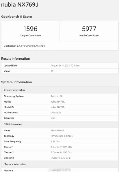 Prosessorun Geekbench test nəticələrini Digital Chat Station ləqəbli məşhur insayder təqdim edib. Məlumatda qeyd edilib ki, Snapdragon 8 Gen 3 hələ təqdim edilməmiş nubia Red Magic 9 smartfonunun tərkibində test edilib. Geekbench testləri nəticəsində məlum olub ki, Qualcomm-un yeni flaqman prosessoru özündə 3.19 GHz tezlikdə çalışan bir ədəd super performanslı nüvəni, 2.96 GHz tezlikdə çalışan 5 ədəd performanslı nüvəni və 2.27 GHz tezlikdə çalışan bir neçə enerji effektivliyi nüvəsini birləşdirir. İnsayder bildirib ki, söhbət, Cortex-X4, Cortex-A720 və Cortex-A520 nüvələrindən gedir. Nəticədə Snapdragon 8 Gen 3 Geekbench-in bir nüvəli testi çərçivəsində 1596 xal, çox nüvəli testi çərçivəsində isə 5977 xal toplayıb.