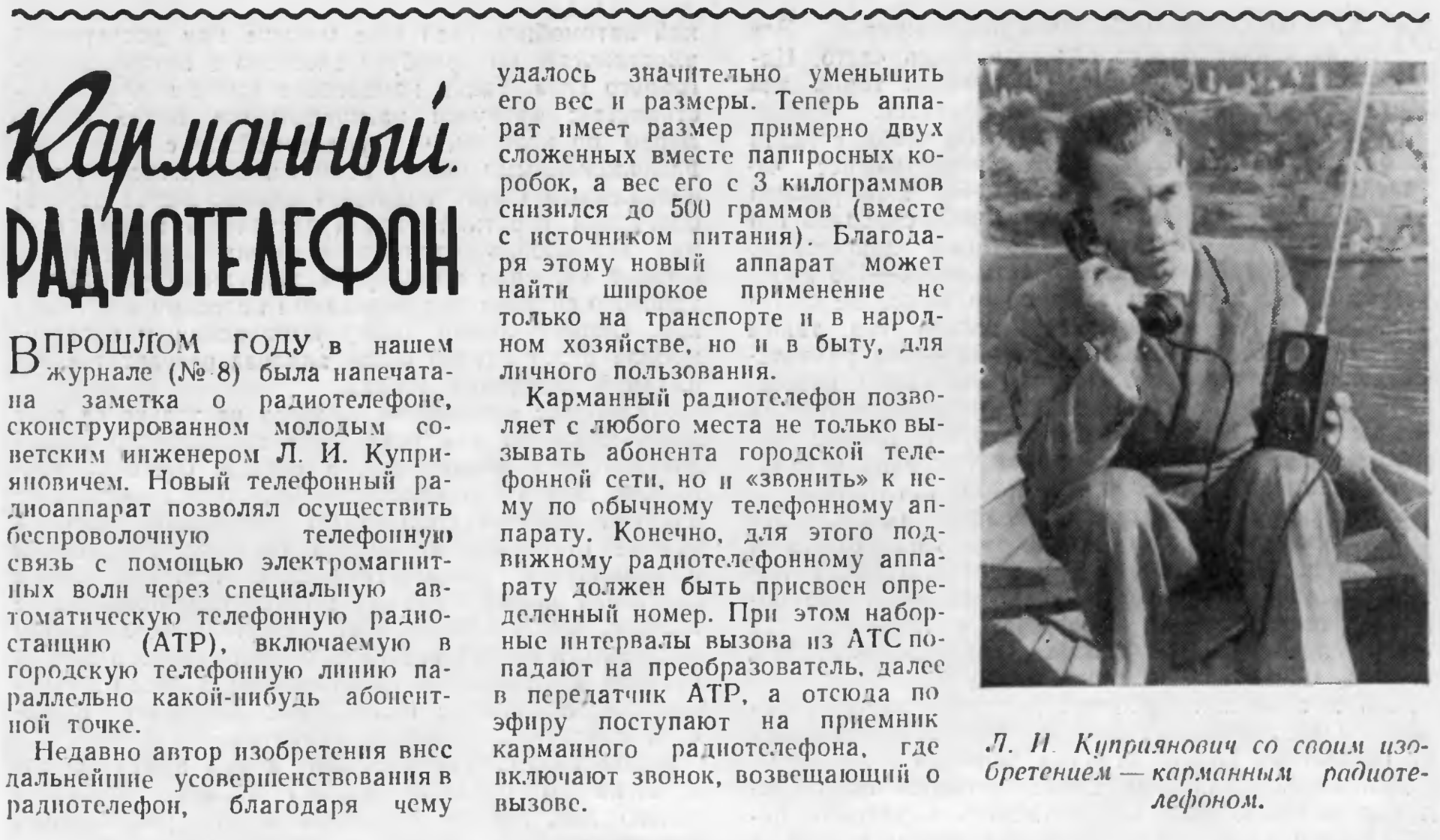 Sovet radiomühəndisi Leonid İvanoviç Kupriyanoviç, 1957-ci ildə LK-1 adlı ilk işlək vəziyyətdə olmuş portativ telefonu təqdim etmişdi.