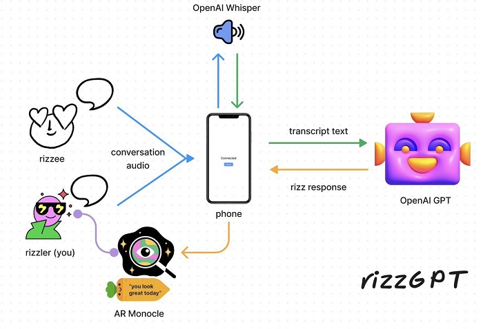 Bryan-ın öz Twitter hesabında rizzGPT ilə bağlı paylaşmış olduğu təlimatda qeyd edilib ki, bu sistem AR + AI dəstəkli fon hesablamaların yeni dövrünün başlanması deməkdir. Onun sözlərinə əsasən bu cür dövrdə hər kəs 24/7 aktiv olacaq fərdi köməkçisinə sahib olacaq. Tələbə rizzGPT-nin necə çalışdığını sərgiləyib. Təqdim edilmiş videolardan birində o, rizzGPT-dən müsahibə zamanı istifadə edib. Videodan da görmək olar ki, Bryan müsahibə suallarına eynəyə bərkidilmiş Monocle AR cihazı vasitəsilə cavab verir. Monocle AR-in ekranı müsahibə suallarının cavabları Bryan-a birbaşa ChatGPT-dən ötürür. Digər bir videoda isə görmək olar ki, Bryan öz dostu ilə qarşılaşan zaman rizzGPT onun şəxsiyyətini təyin edə bilir.