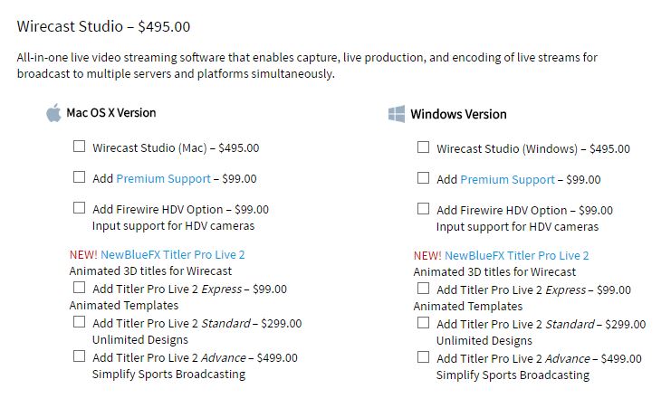 Wirecast Studio - Standart paket 495 dollardan təqdim olunur. Proqrama ümumi xarakterli bütün funksiyalar daxildir. Həm Mac, həm də Windows əməliyyat sistemlərində işləyən proqrama əlavə olaraq aşağıdakı funksiyaları da ala bilərsiniz.