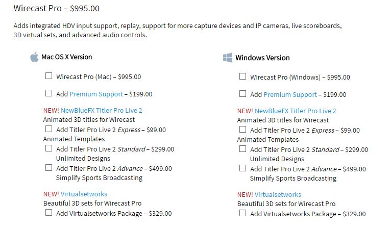 Wirecast Pro - Tam funksional paket isə 995 dollardan təqdim olunur. Standart paketdən fərqli olaraq premium dəstəyə də sahib olan bu versiya böyük kütlələr üçün nəzərdə tutulan yayımlar üçün idealdır. Aşağıda proqram üçün təqdim olunan bir sıra əlavə funksiyalar da vardır.