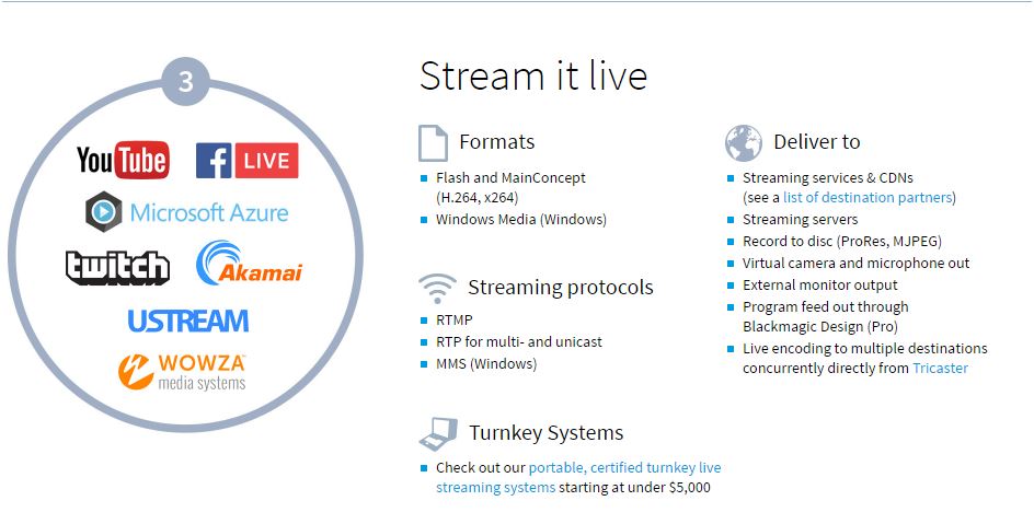 Yayım məqsədinizdən asılı olaraq istədiyiniz bütün funksiyalara bir proqramda, sadə interfeysdə sahib ola bilərsiniz. Aşağıdakı şəkildə isə proqramın dəstəklədiyi formatları və protokolları görürsünüz. Şirkət proqramın qlobal olması üçün proqram üzərində daim işləyir. Proqramın bu xüsusiyyətləri barədə daha çox məlumat almaq istəyirsinizsə, buradan proqram haqqında oxuya bilərsiniz.