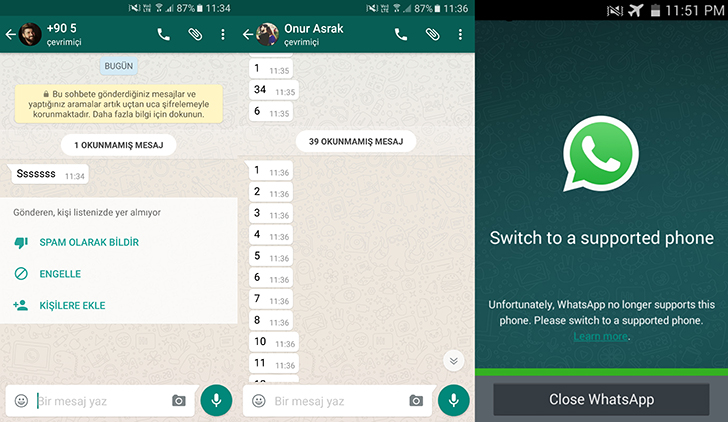 Söhbət pəncərələrində də dizayn yeniliyi edən Whatsapp, özündə material dizaynı daha da təkmilləşdirib. Artıq sizə tanımadığınız bir şəxs yazdıqda, söhbət pəncərəsi boz rəng almır və aşağıdakı şəkildəki kimi sadə və eleqant görüntü ilə qarşınıza çıxır. Hər hansı söhbət pəncərəsində oxunmaya bütün mesajları keçib ən sonuncu hissəyə çatmaq üçün isə yeni "ox” əlavə olunub. Bildiyimiz kimi Whatsapp bəzi telefonları da artıq dəstəkləmir. Əgər sizing də cihazınız bu siyahıda olarsa, onda Whatsapp avtomatik olaraq sizə bildirəcək.
