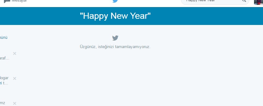 Yeni il münasibətilə sosial şəbəkələr çox aktivdir. Məlumat verdiyimiz kimi Whatsapp-da problem yaşanmaqdadır. Yeni il təbriklərini çatdırmayan şəbəkələrdən biri də twitter-dir. Çox saylı twitlər, şəkil və video yükləmələri eyni zamanda canlı yayımlar twitter-də problemlərin yaranmasına səbəb olub. Hal hazırda şəbəkə istifadəçiləri şəkil, video yükləməkdə problem yaşayırlar. Bu problemin bir neçə saat daha davam edəcəyi istisna deyil.